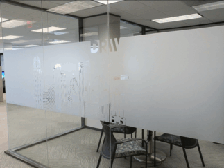 Custom vinyl graphics include frosted privacy films for office glass, full-color wall murals, and precision-cut logos for windows and doors.