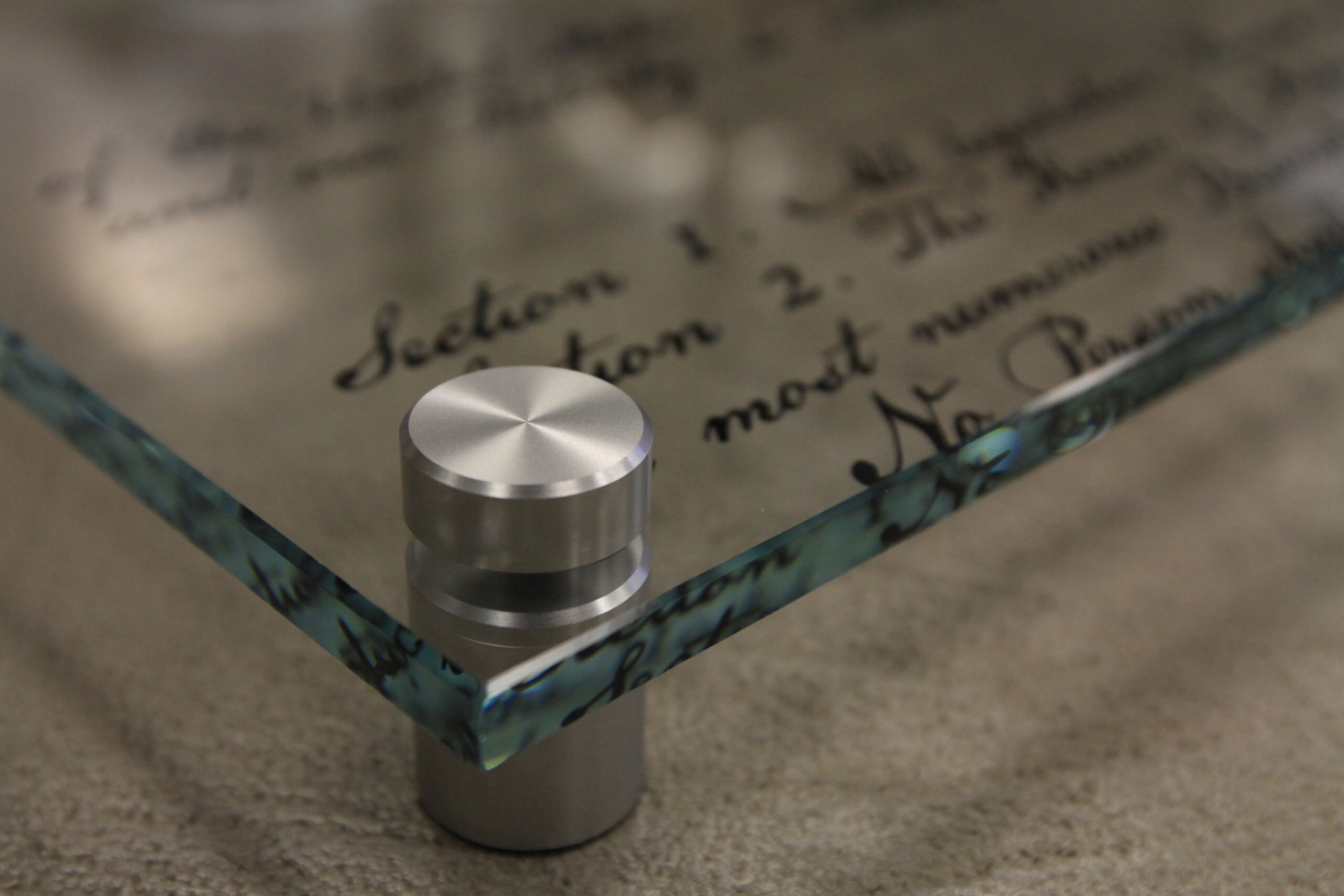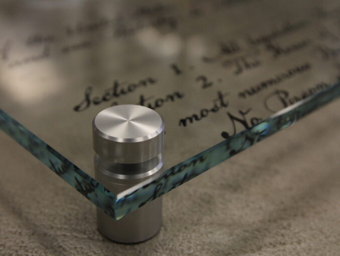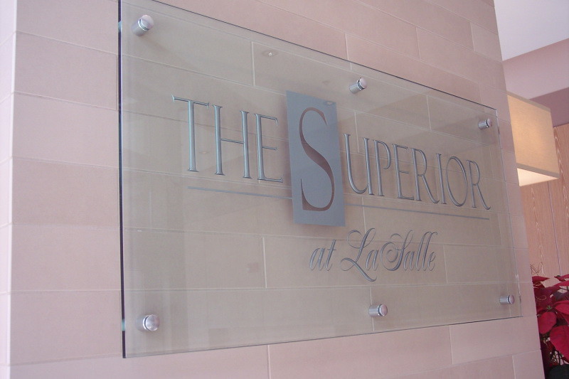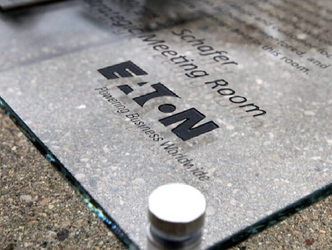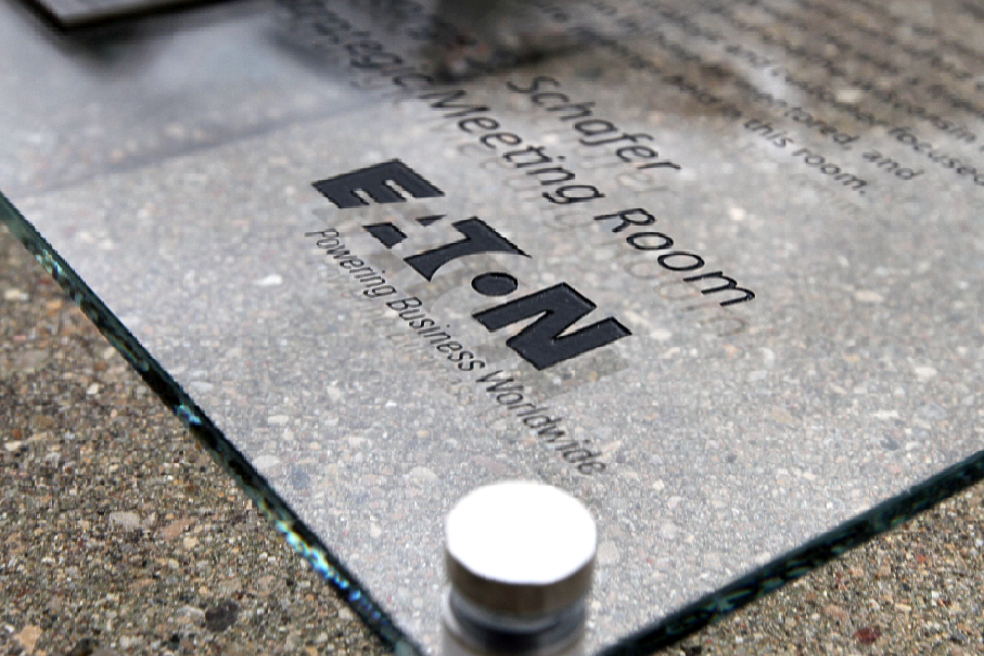 Etched glass signs are produced by sandblasting the surface of Jade or low-iron clear glass to create a frosted, semi-opaque design. Lettering and logos are often etched and paint-filled in metallic or brand colors. These signs offer a clean, high-end look and are commonly used in lobbies, conference rooms, donor walls, and memorials.