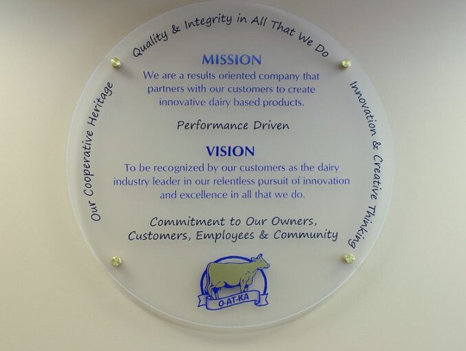 These signs were part of a 16 sign project that spanned multiple locations including the O-At-Ka main office building and their manufacturing location. The signs are made of frosted glass and acrylic. The Etched glass signs were sandblasted and etched, then painted in O-At-Ka corporate colors. The acrylic signs have full color UV graphics printed onto the face. O-AT-KA’s mission and vision, as well as their core values were included on the signs and they were affixed with brass stand offs. It is evident from the placement of the signs that the core values of O-AT-KA are more than just words to the company. The signs are a constant reminder to live those values daily. This is something that Impact Signs shares with O-AT-KA and we are proud to have created a tangible link to those values.