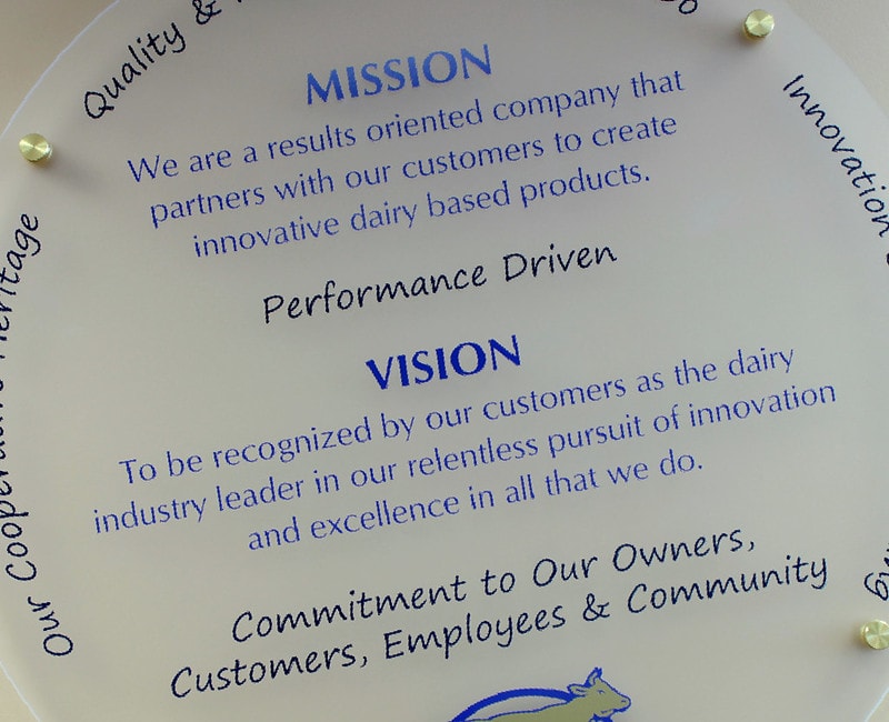 Email us a copy of your mission or vision statement and we can help develop a sign project that will inspire and engage your employees and visitors to your location. These are suitable for interior or exterior use and can be made in a variety of colors and materials including glass, acrylic, and even metal panels. Many sizes and shapes are available and the project will be tailored to your needs. Let us know how we can help you project your vision here!