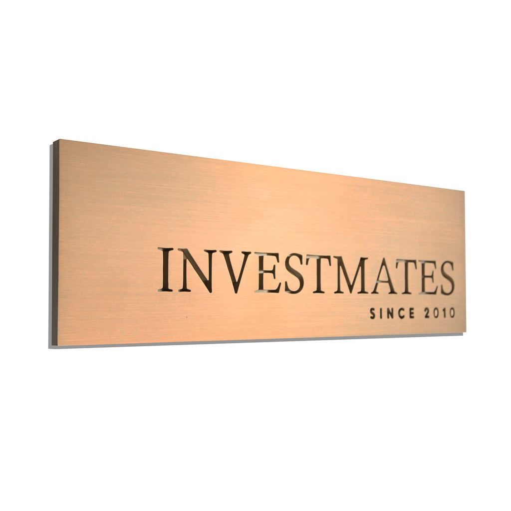 48" wide 1/4" thick Brushed Brass logo and lettering for interior insurance company lobby sign Installed on custom layered wall panels