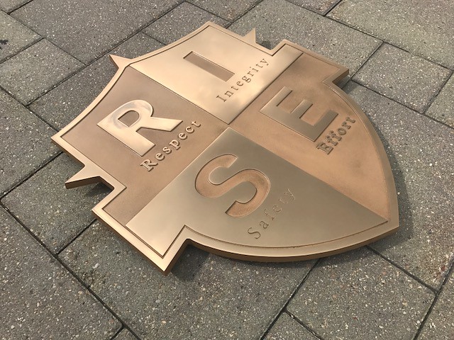 19.9"w x 24"h bronze plaque with Polished letters and border with bead blasted background Custom shape shield per customer file Single line border blind studs for brick
