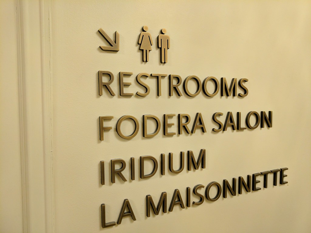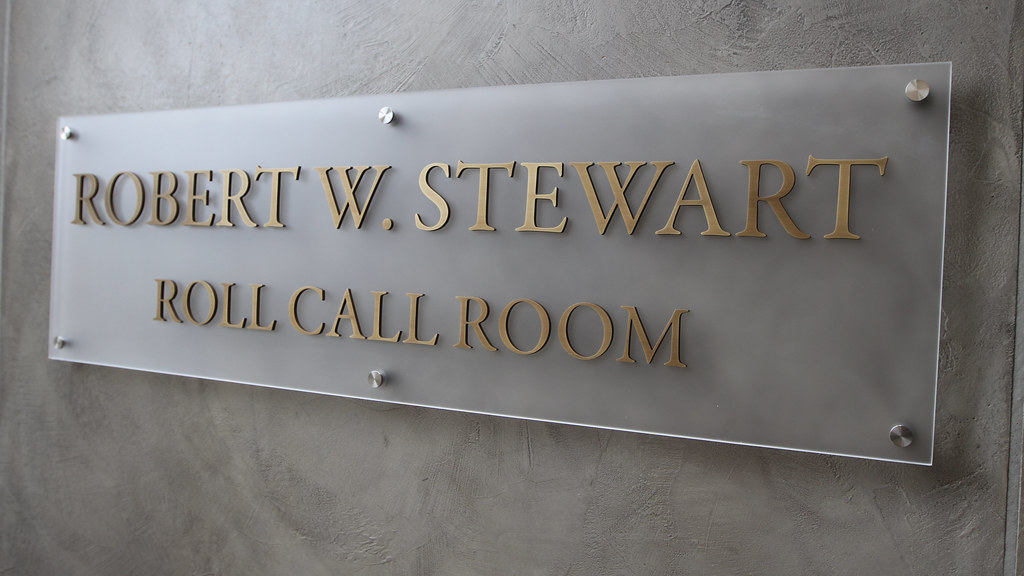 Conference room name dedication sign brushed bronze lettering assembled on frosted acrylic panel
