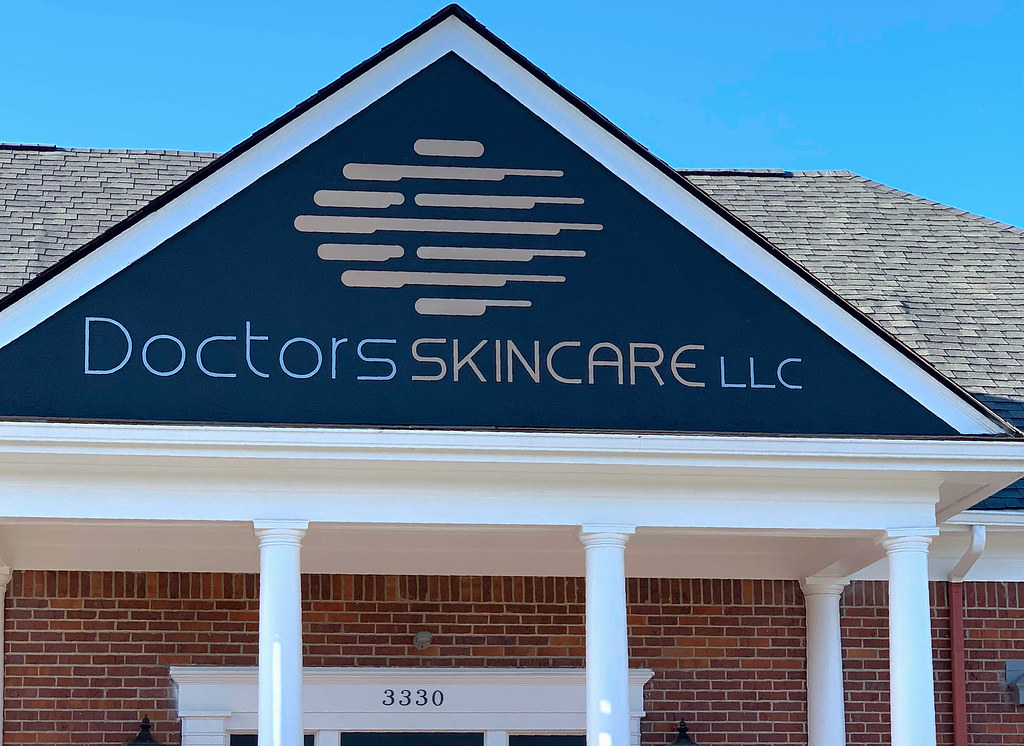 Overall 156" wide 1/4" thick Brushed Bronze Logo and SKINCARE Doctors and LLC in Brushed Aluminum material Includes stud mounts installation template and Spacers to "float" your letters