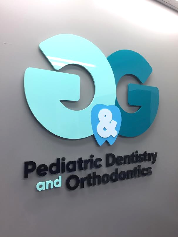 42" wide 1/4" thick Custom Painted acrylic logo; GG and blue tooth shape will be mask & painted with Raised White 1/8" &(ampersand) shape assembled on face of blue tooth area; Individual cut lettering: Pediatric Dentistry and Orthodontics; Studs and Spac