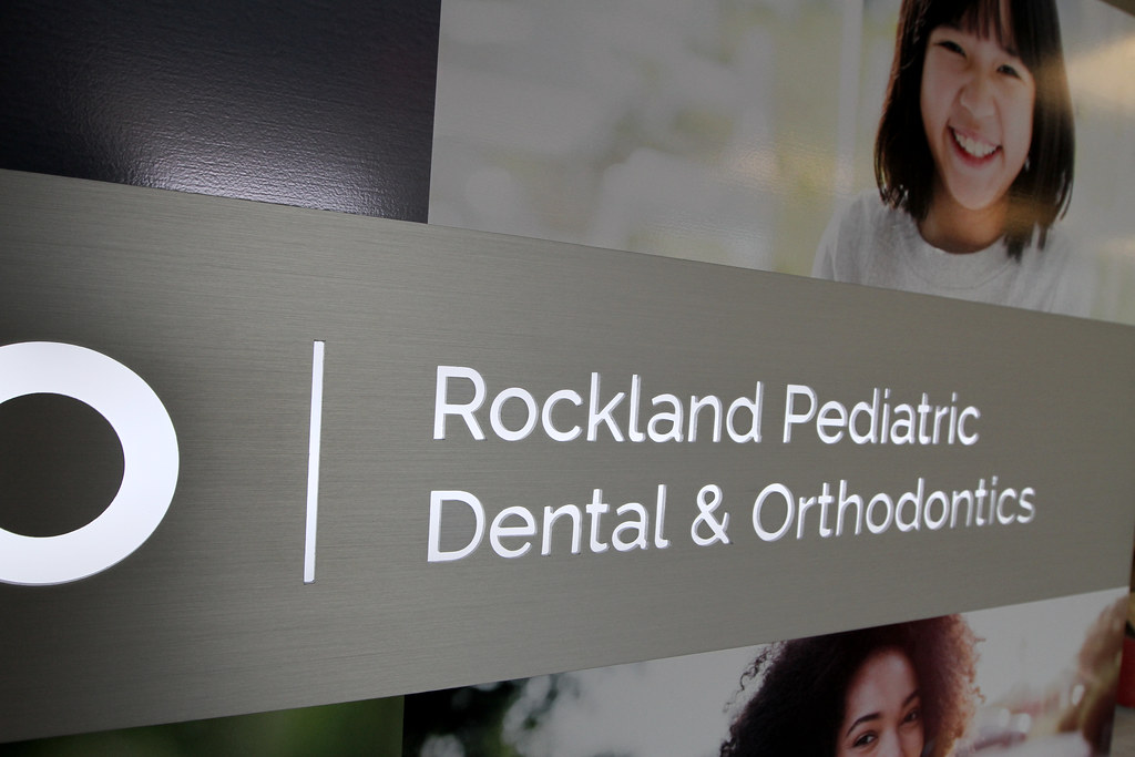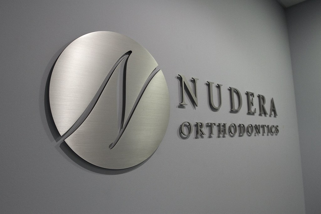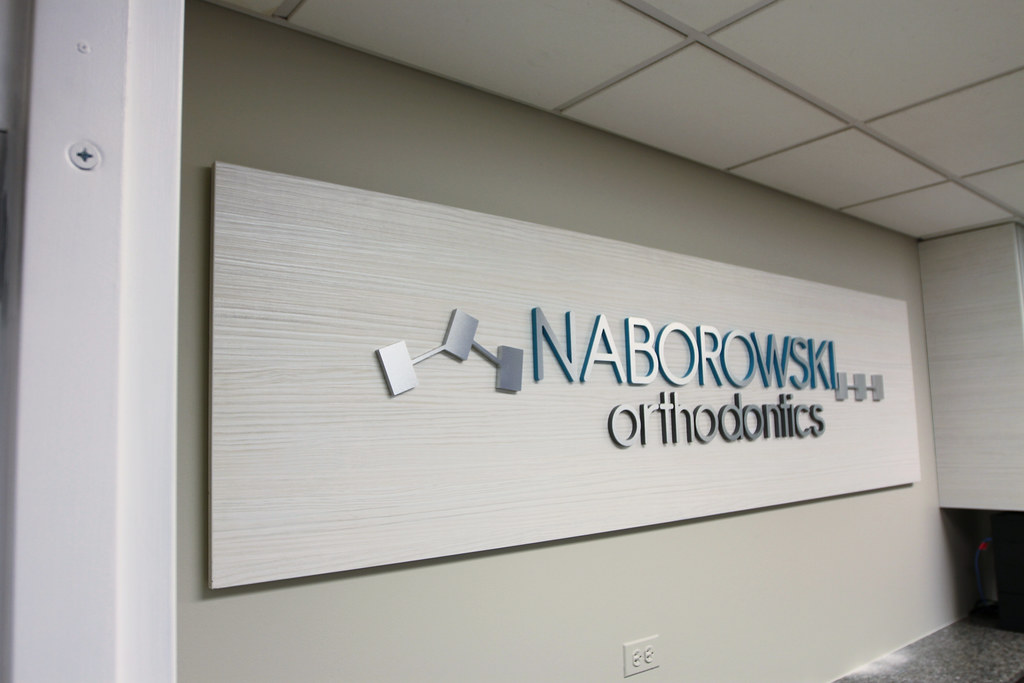 Metal laminate letters installed on laminate wood panel for orthodontics office sign