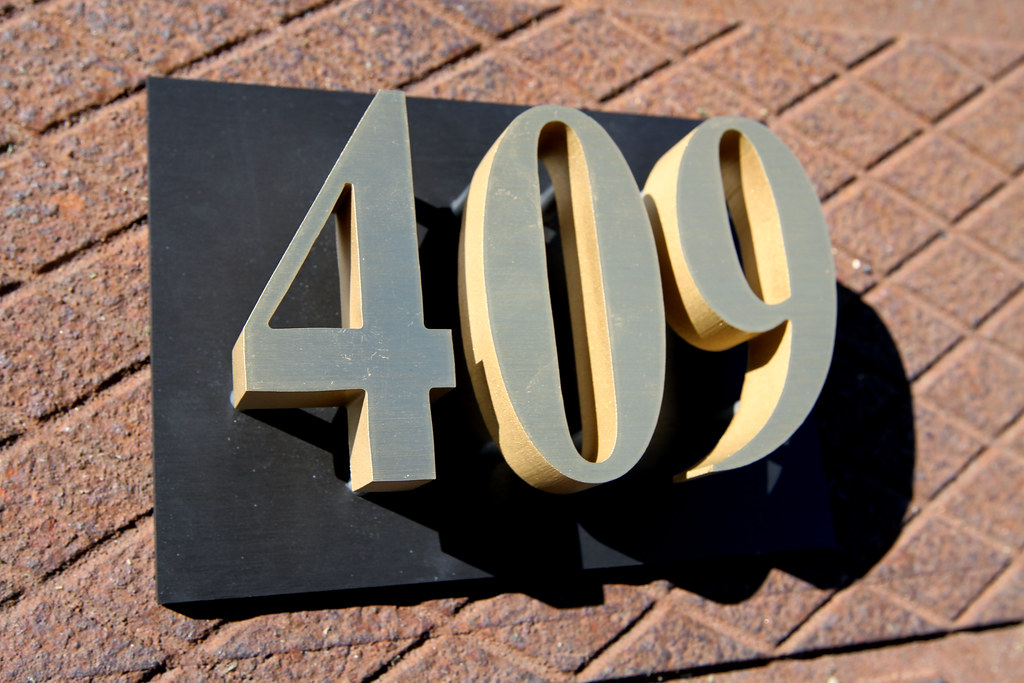 1/4” thick anodized aluminum with 3/4” thick brushed brass numbers fastened with countersunk screws and 3/4” spacers