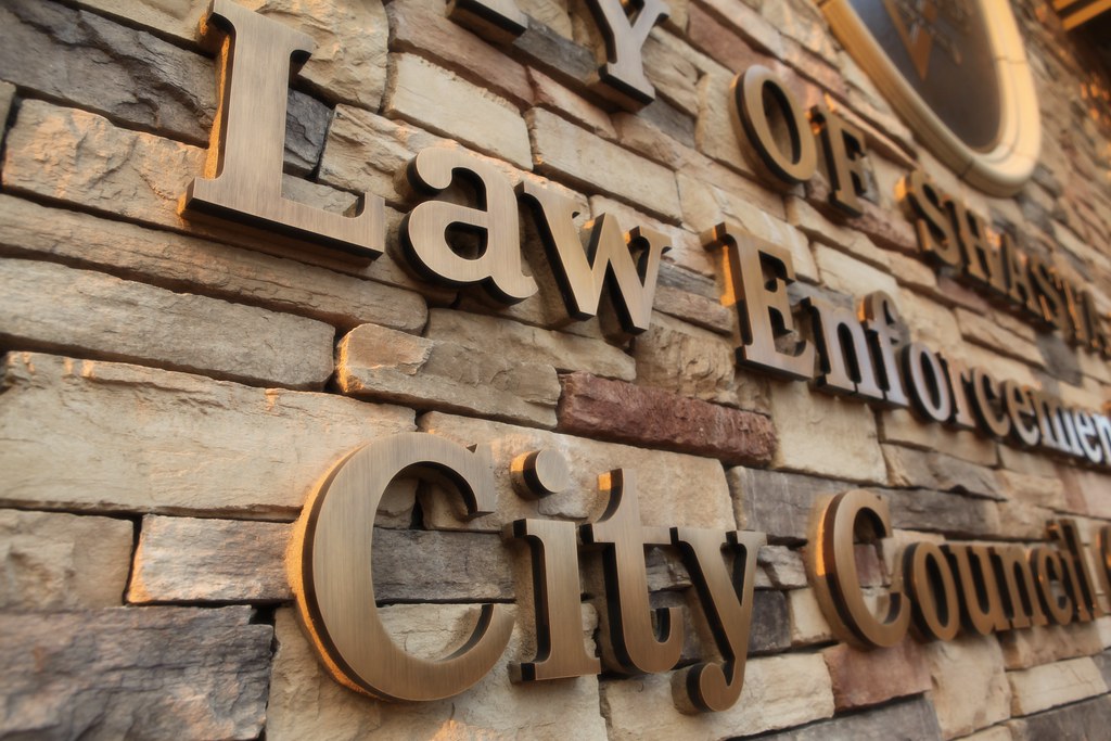 Cast bronze lettering detail oxidized finish