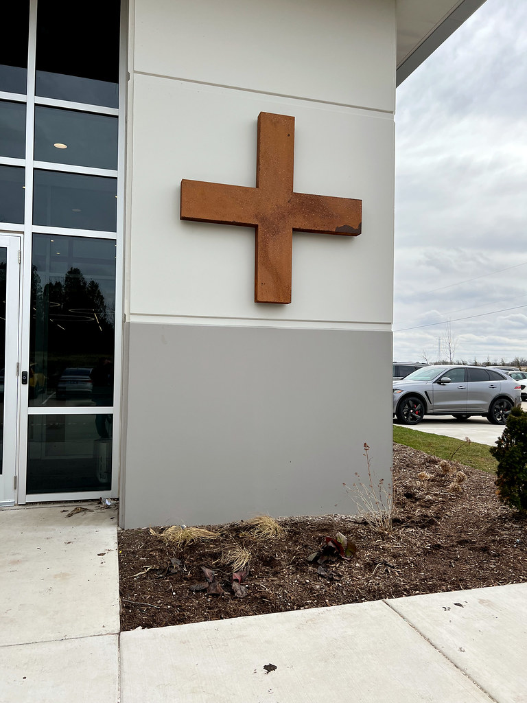 63" height 4" deep Fabricated Metal Corten Steel NON lighted Blind studs with 1" spacers exterior use mounting (corten steel rust will 'bleed' onto surfaces) 12" width brushstroke of cross