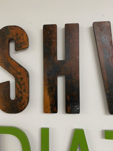 Flat cut letters in Hot Rolled Steel. Natural Rust Finish. 1/4in thickness with stud mount and spacers.
