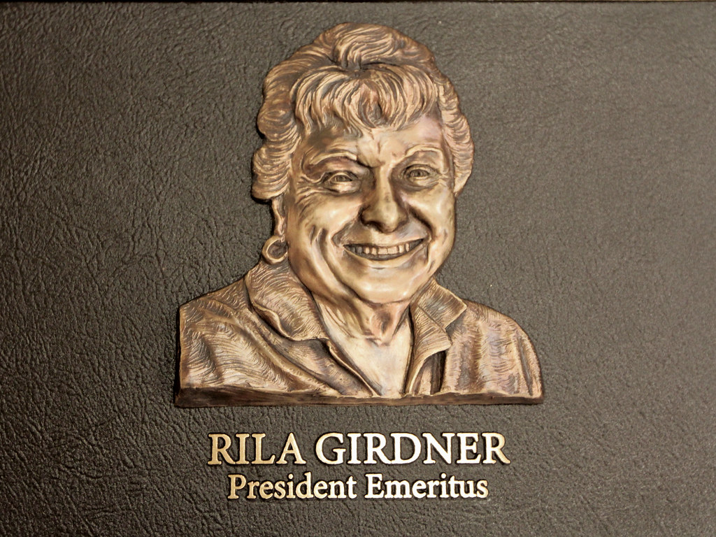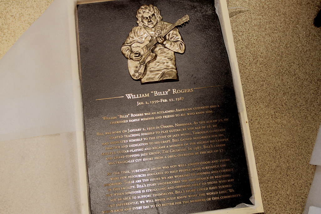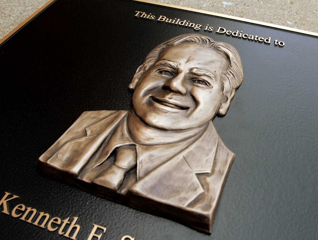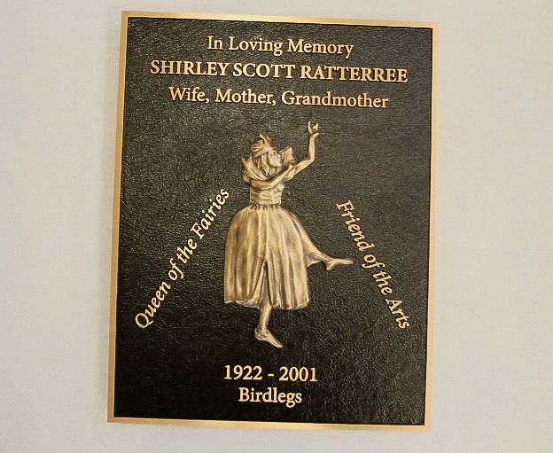 Bronze bas relief image of man laughing on dedication plaque