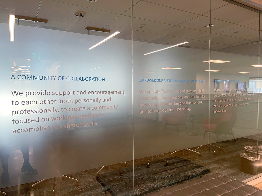 CORE VALUES wording design to fit on frosted privacy glass 47.5 h x 45" w Vinyl graphics 2 color layout