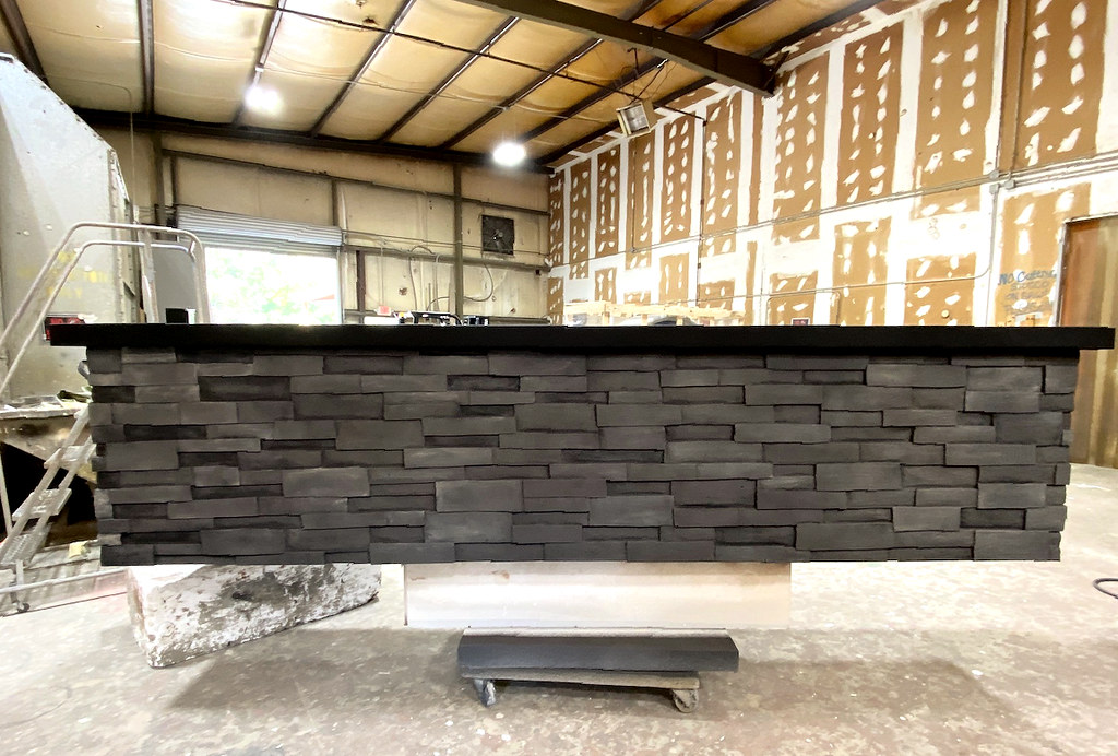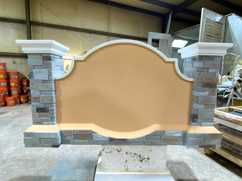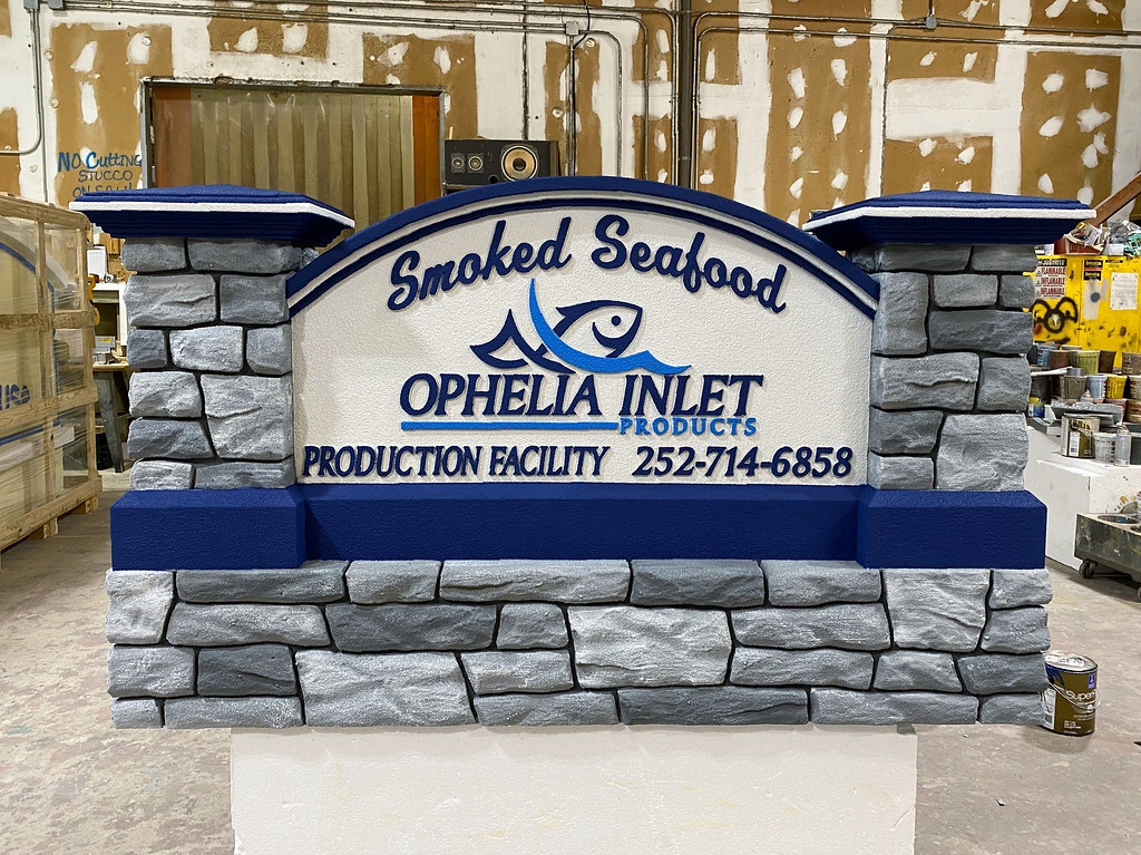 Acrylic panel sign with raised acrylic logo and letters painted in custom colors Installed with (4) 1" diameter standoffs onto uneven wood wall.