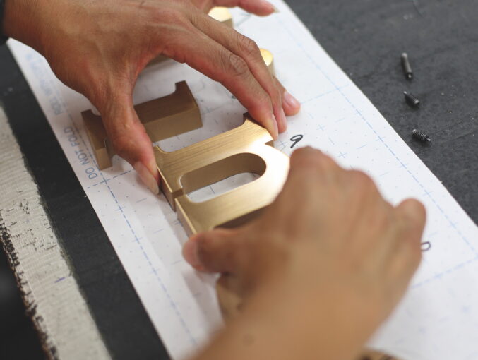 Cut bronze letters are waterjet-cut from solid bronze plate, then finished with a brushed (sanded) surface for a clean, satin appearance. This process results in sharp edges and a smooth, flat face.