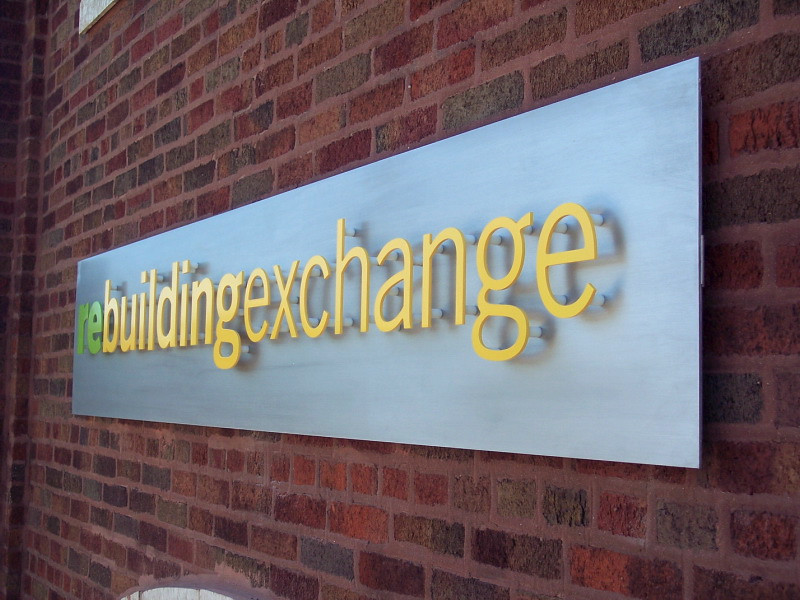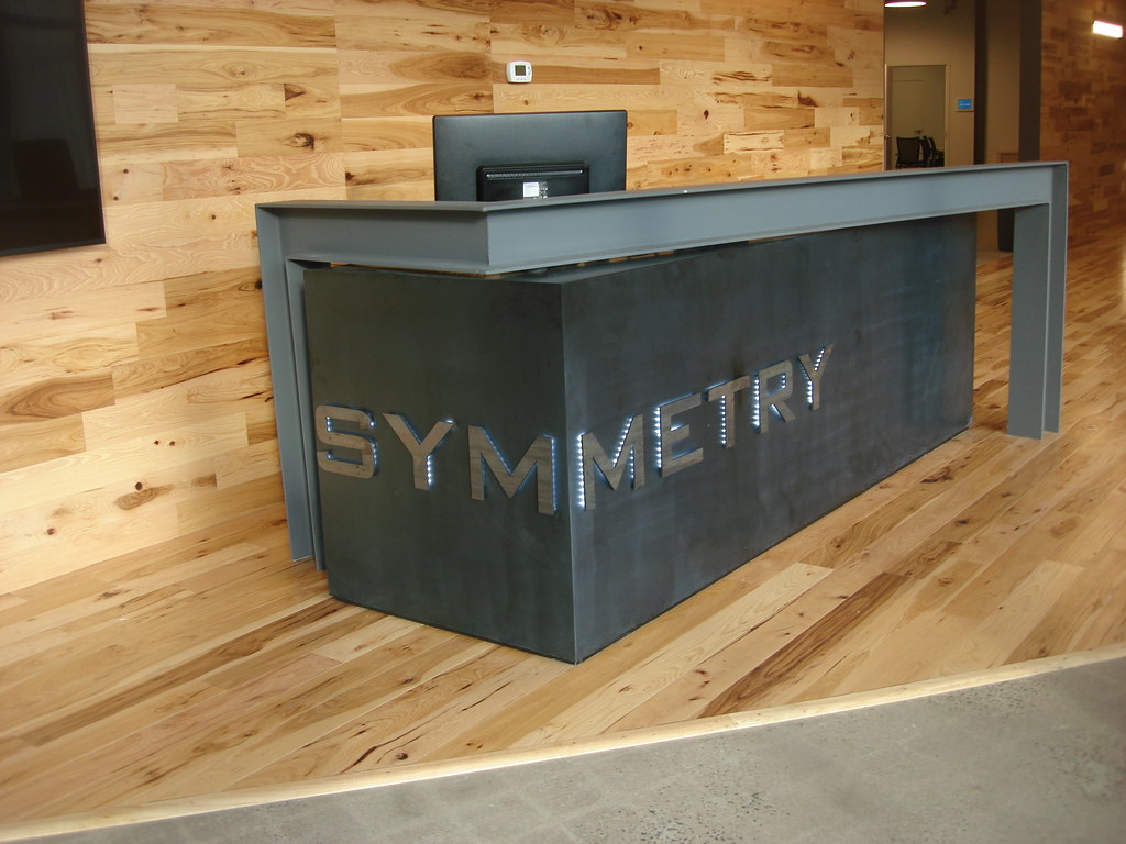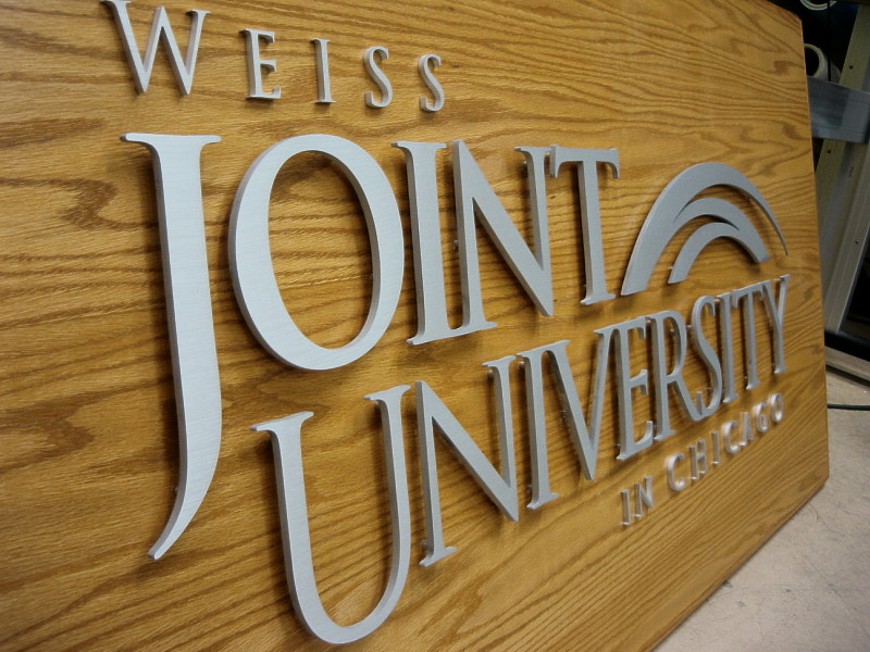 Waterjet cut aluminum letters painted and assembled to brushed aluminum panel.