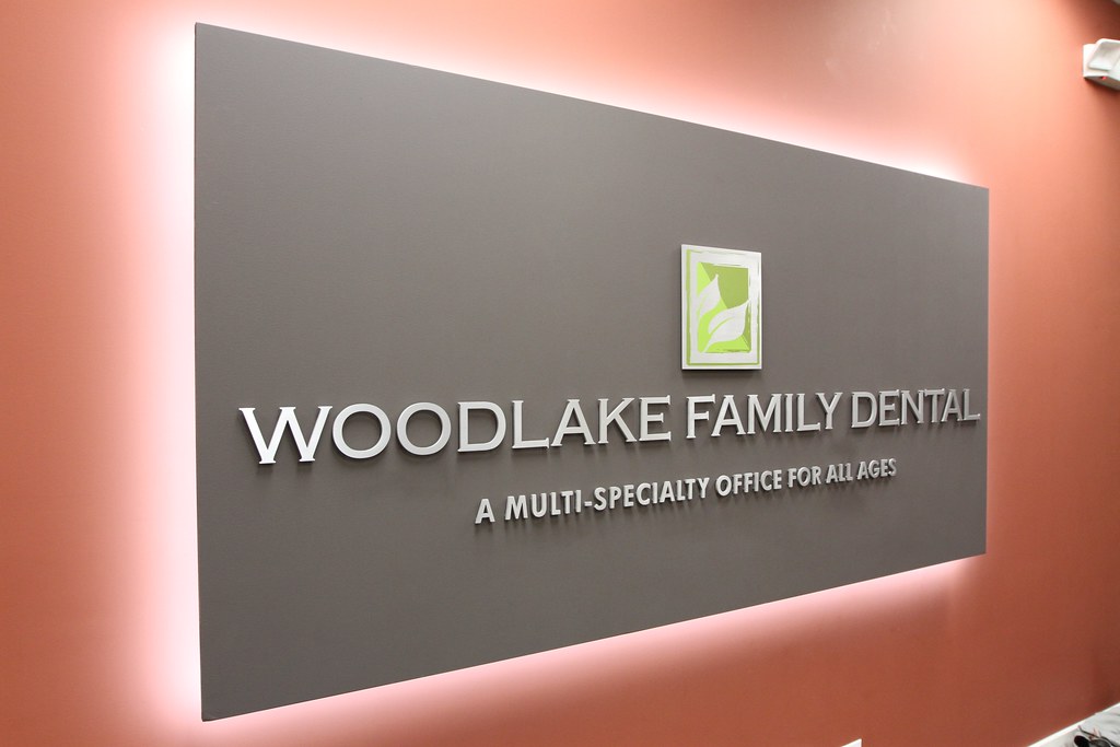 Backlit panel sign with raised spacer mounted cut lettering and logo assembled on face of panel interior dental office sign