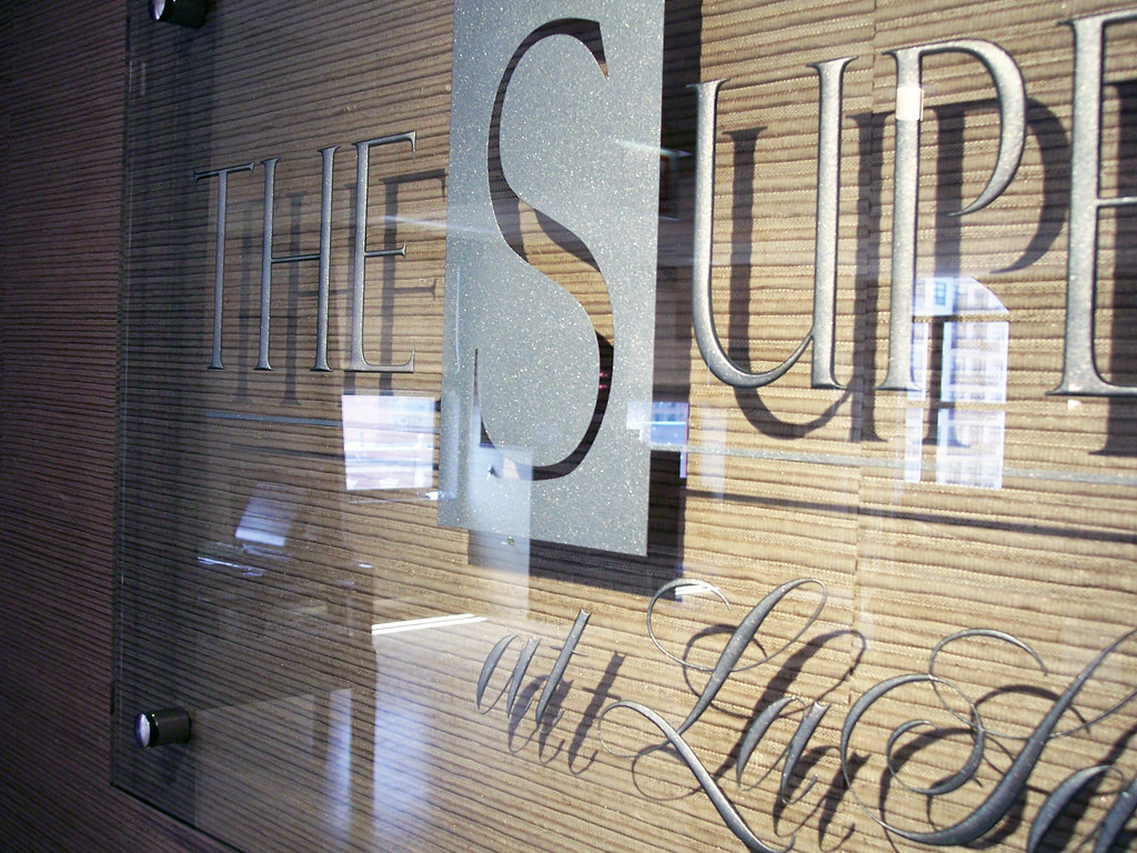 Clear Glass Panel Sign with Brushed and Polished Metal Logo applied to face. Installed with six Stainless Steel Standoffs on drywall.