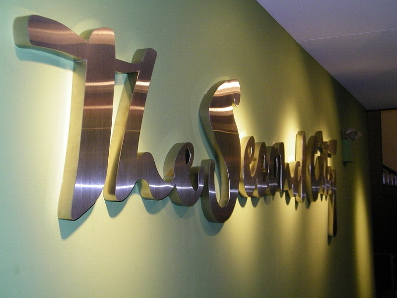 Fabricated Stainless Steel Logo with satin finish. 2 inches deep stud mounted to wall