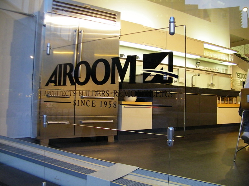 Half inch thick clear glass reverse etched and paint filled logo metallic silver. Installed with stainless steel stand offs.