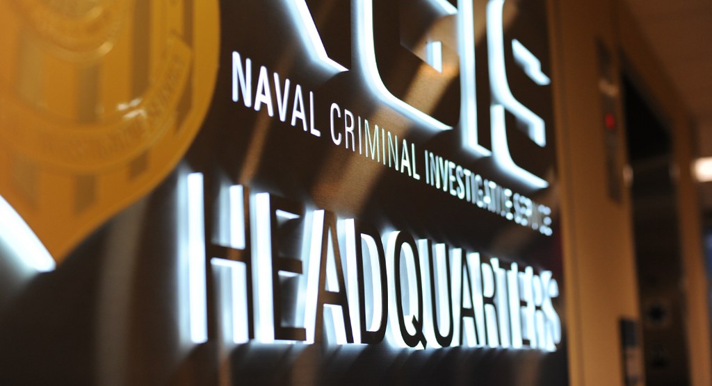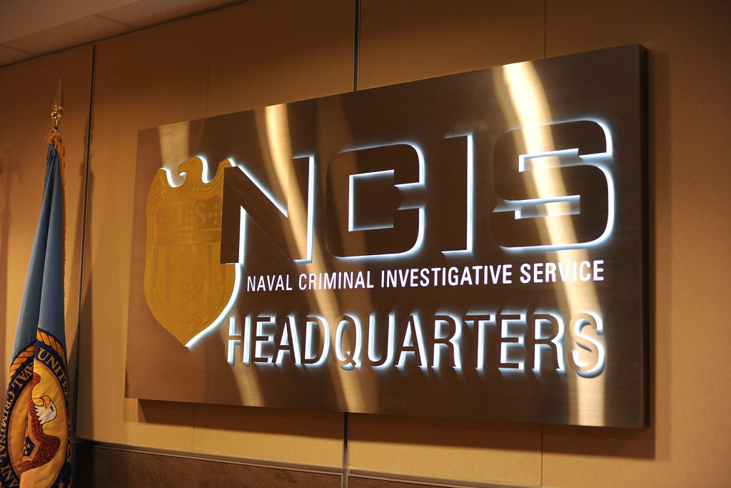 NCIS Headquarters Lighted Lobby Sign fabricated stainless steel panel with pushthru acrylic letters and graphics for edge lighting detail