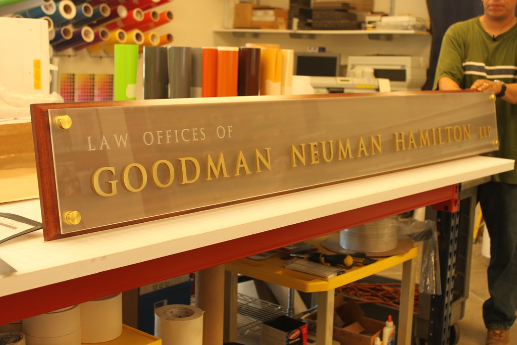 Raised Brass letters assembled on etched glass panel installed on stained wood backer panel with gold standoffs for law office sign
