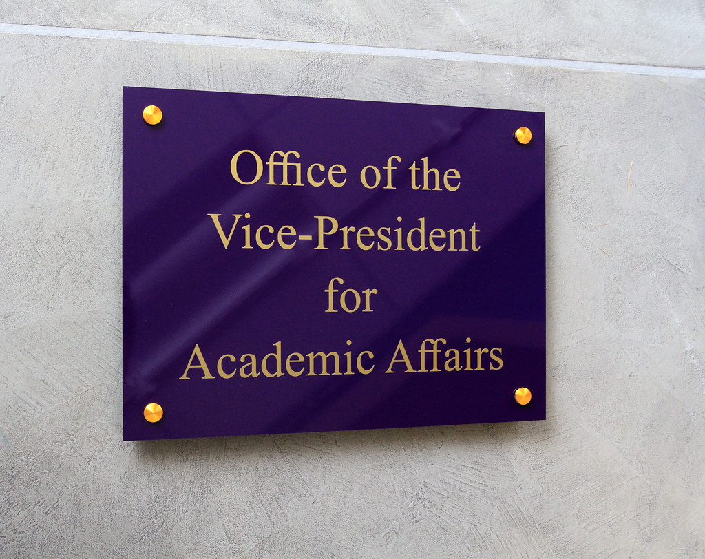 24"w x 18"h Acrylic Panel 3/8" thick Painted 2287 Purple acrylic panel with Metallic Gold lettering applied to face (Office of VP) and (4) Gold Painted stand offs for customer installation