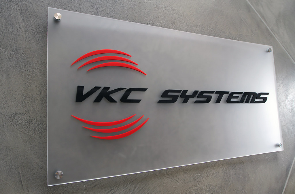 Cut black and red acrylic letters assembled on frosted acrylic panel sign