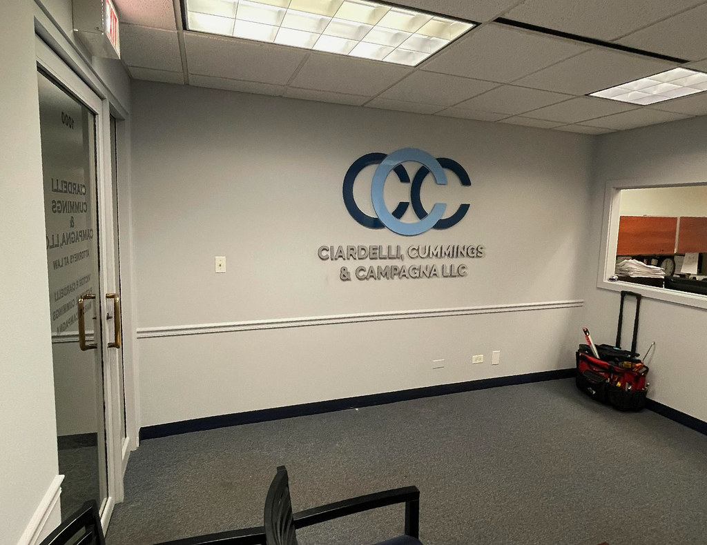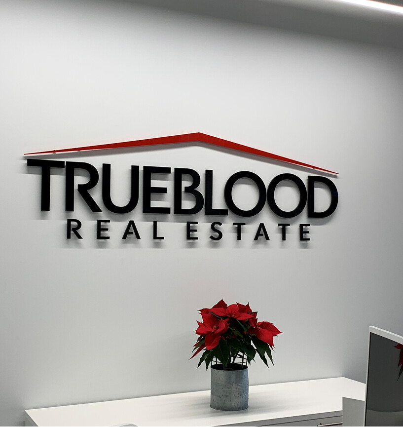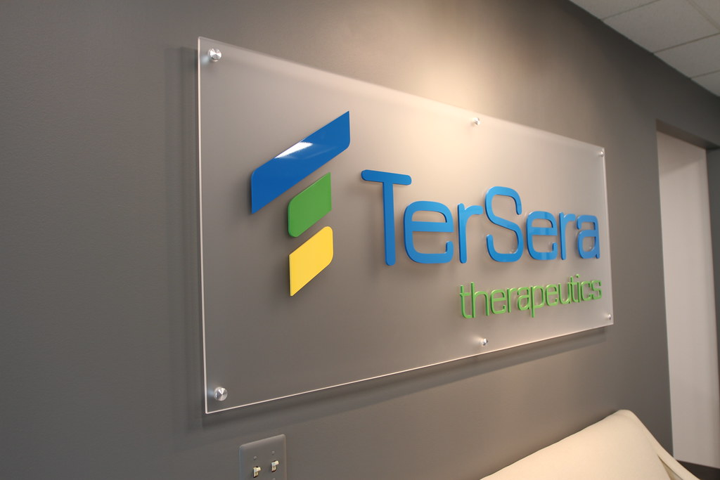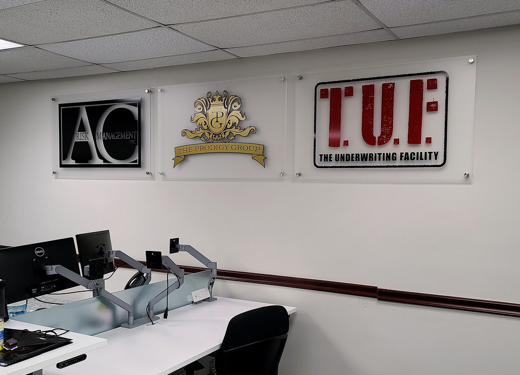 1/4in thick cut acrylic logo and lettering logo shape has full color UV graphics printed on face tagline is cut vinyl on drywall