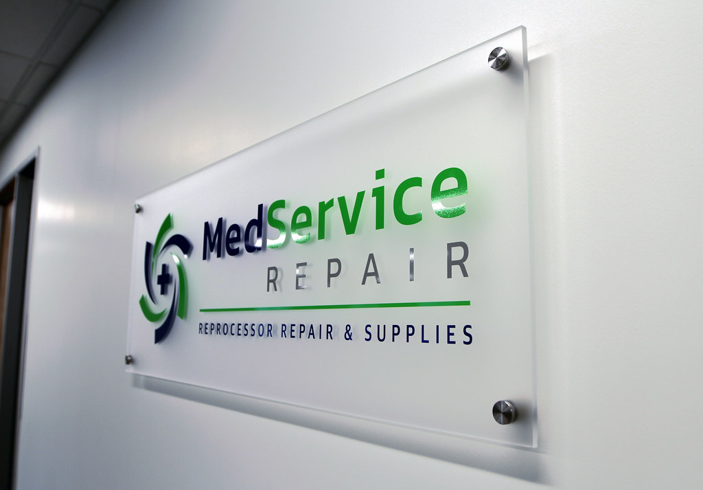 Raised Acrylic logo and lettering assembled flush to frosted acrylic panel sign