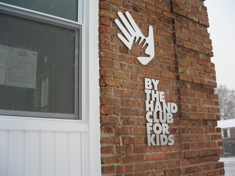 1/4" thick satin aluminum logo stud mounted to exterior bricks