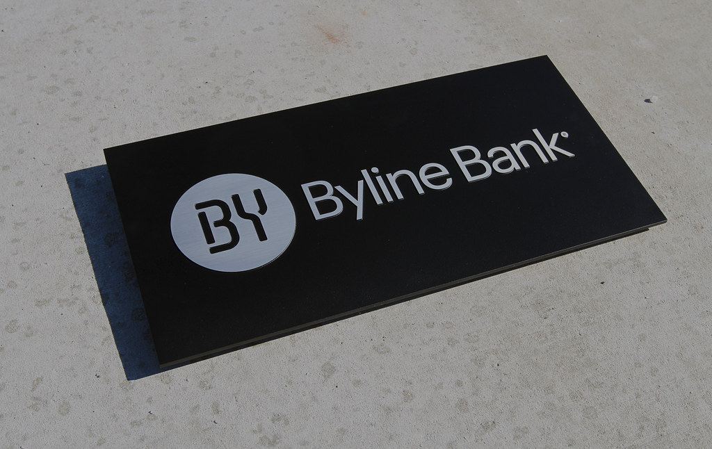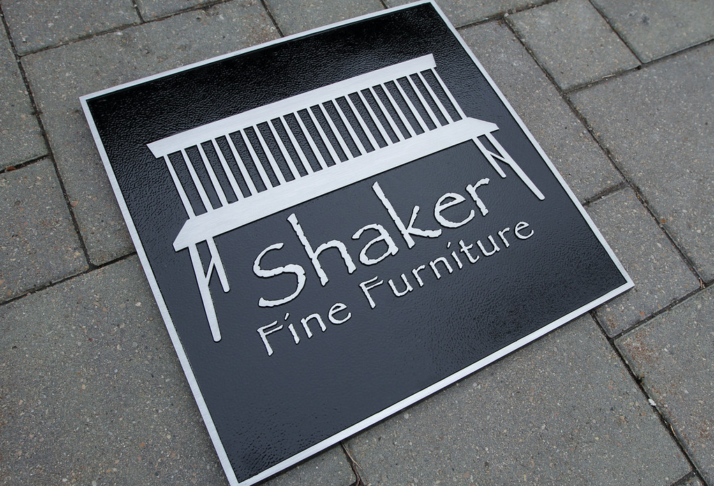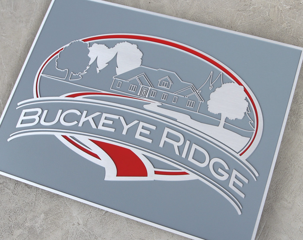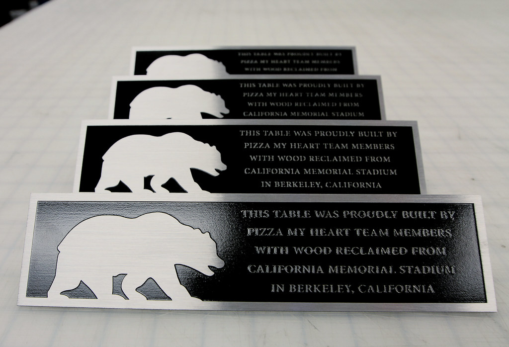 10"w x 2.5"h x 1/8" thick Reverse etched Aluminum plaque Brushed finish Raised areas with Recessed background paint filled black and Blind stud mounts for installation