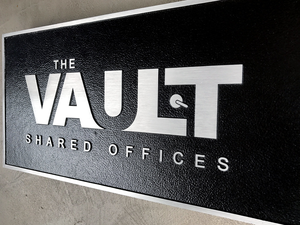 Grey paint filled interior with raised brushed aluminum logo and letters for exterior use
