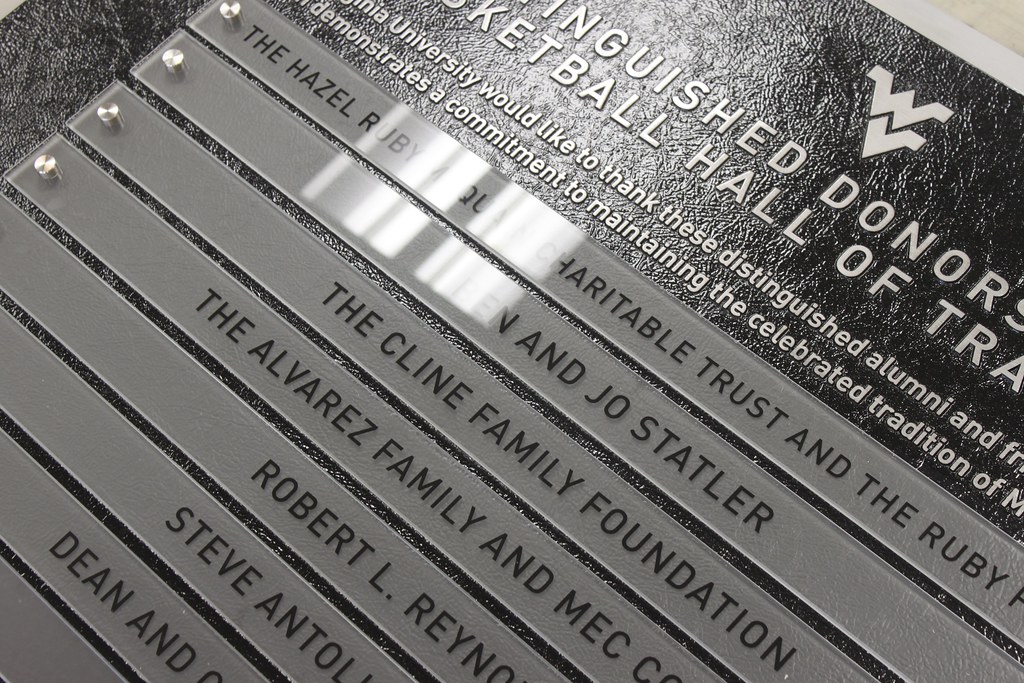 Etched stainless steel donor nameplates assembled on aluminum plaque backer donor levels by size of plaque