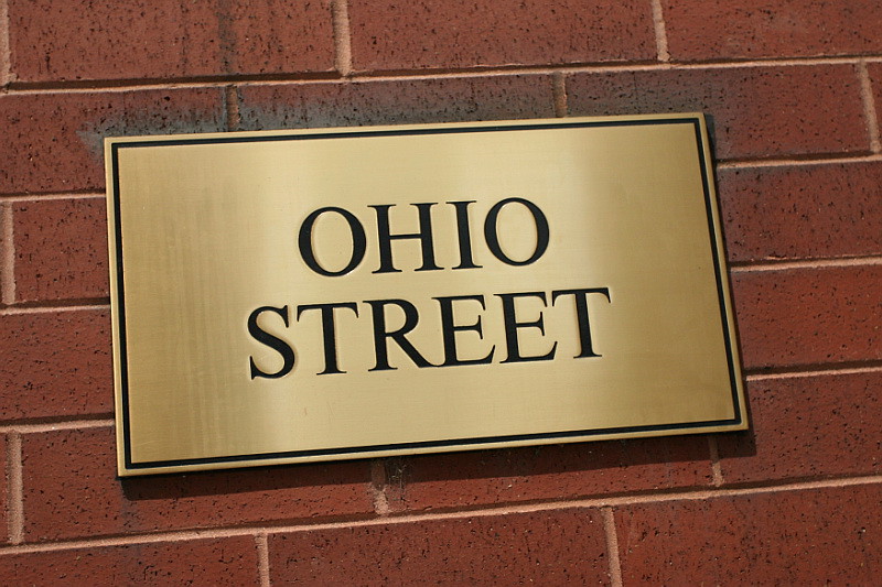 Etched bronze plaques with satin finish. Recessed copy paint filled.