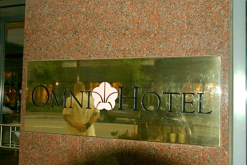 Polished aluminum logo installed on law office lobby wood panel wall.