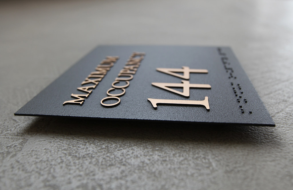 Detail of bronze raised lettering ADA occupancy sign with Grade II Braille