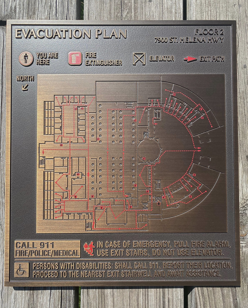 Two Color paint fill Evacuation ADA Map with Oxidized Bronze Finish raised text and map