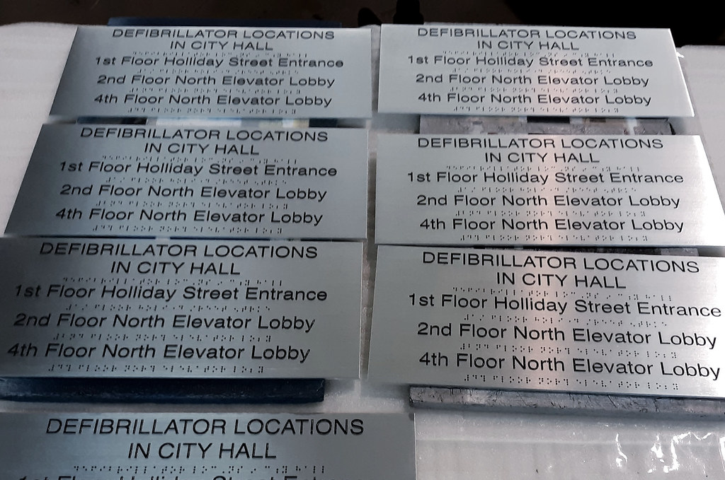 Reverse etched Zinc ADA Defibrillator location wayfinding signs