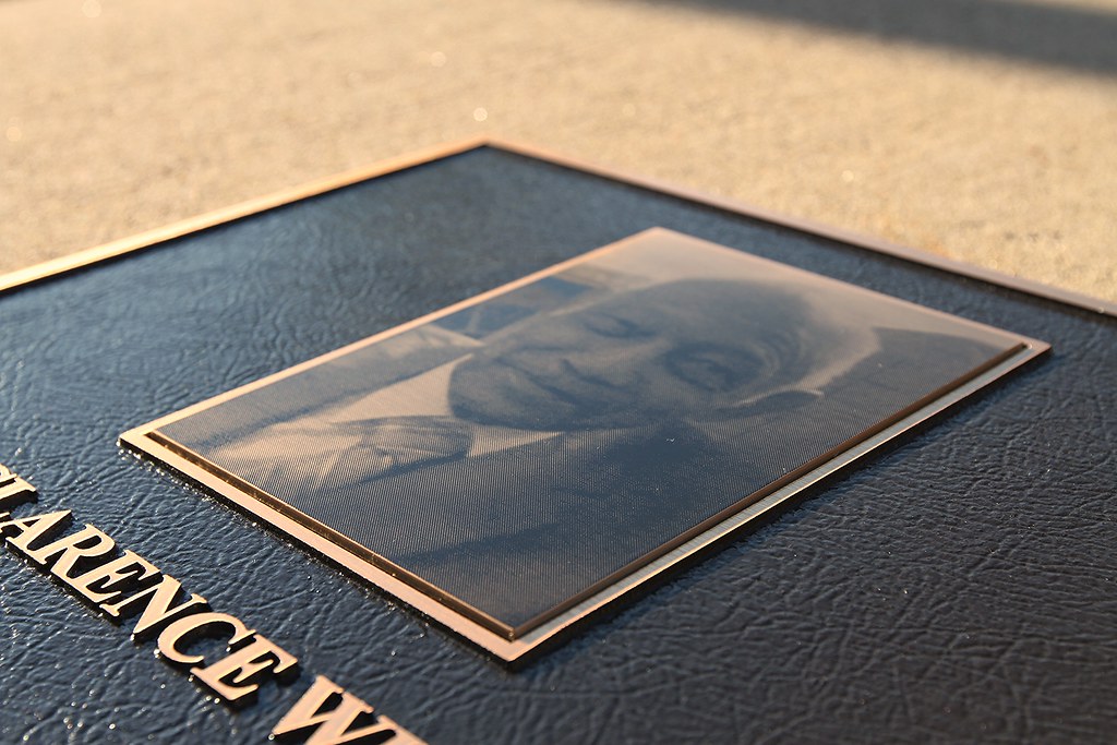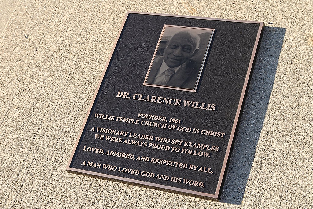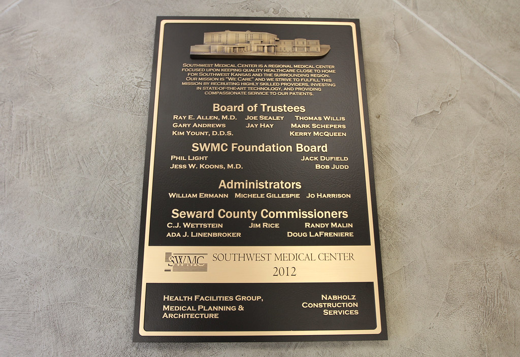 24" x 36" Bronze Plaque Raised Brushed Bronze border & letters Recessed Paint Filled Background Standard Border Modeled Bas relief image of building Blind Mounting