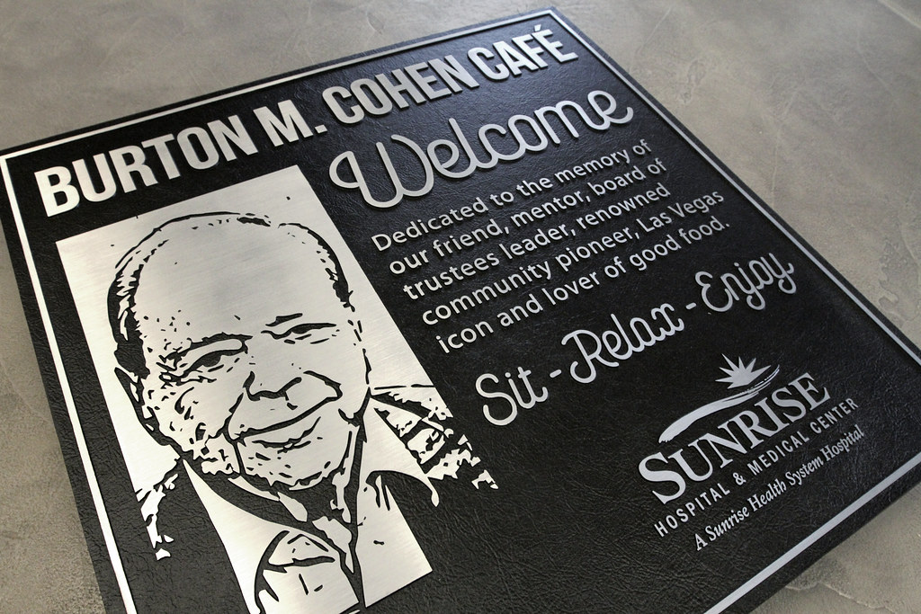 30" x 30" Aluminum plaque Satin finish raised lettering and border Recessed paint filled Leatherette background Blind stud mounting
