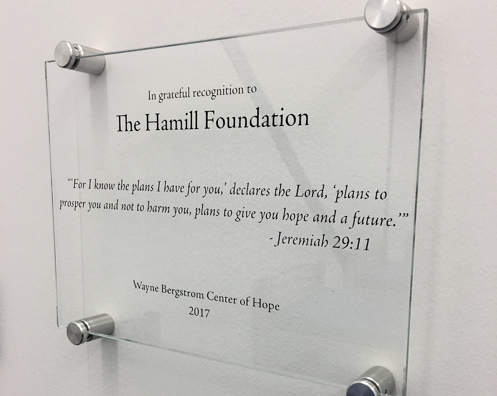 15" x 30 clear acrylic panel with UV Black Text and UV metaphoto image applied on face Includes 4 stainless steel standoffs for interior drywall office installation