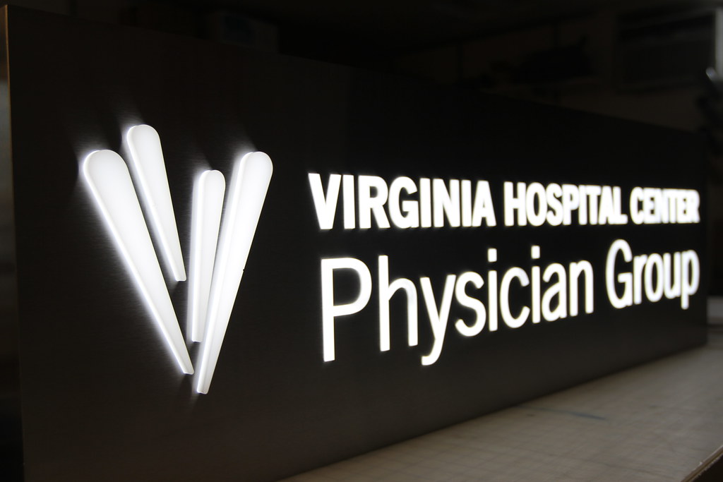 Fabricated panel sign with cut out accent lighted letters and halo backlight accent