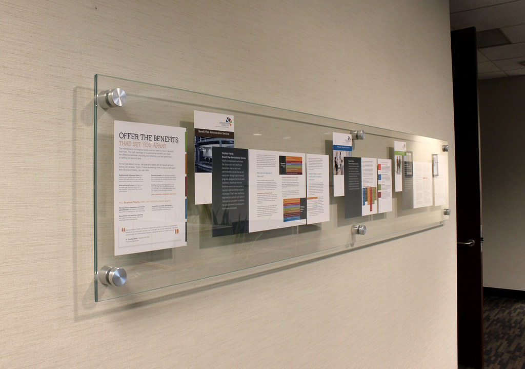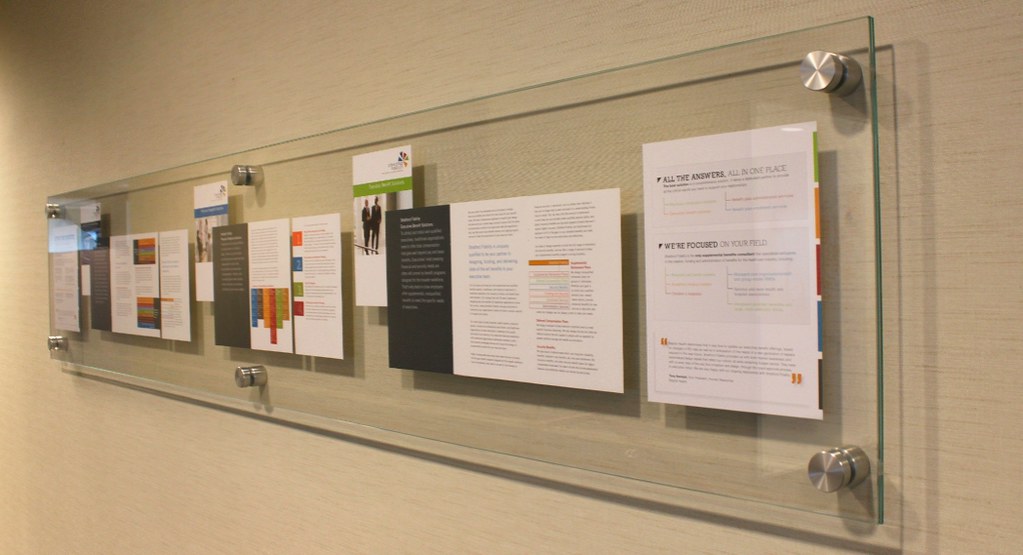 Marketing Brochures Sandwiched between two pieces of starphire clear glass. Stainless Steel Peg Stand Off Hardware. Brochures are removable and can be changed out as needed. This is an architectural art piece for a corporate office.
