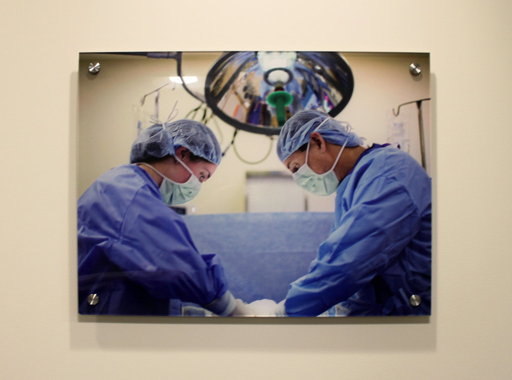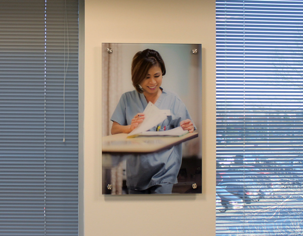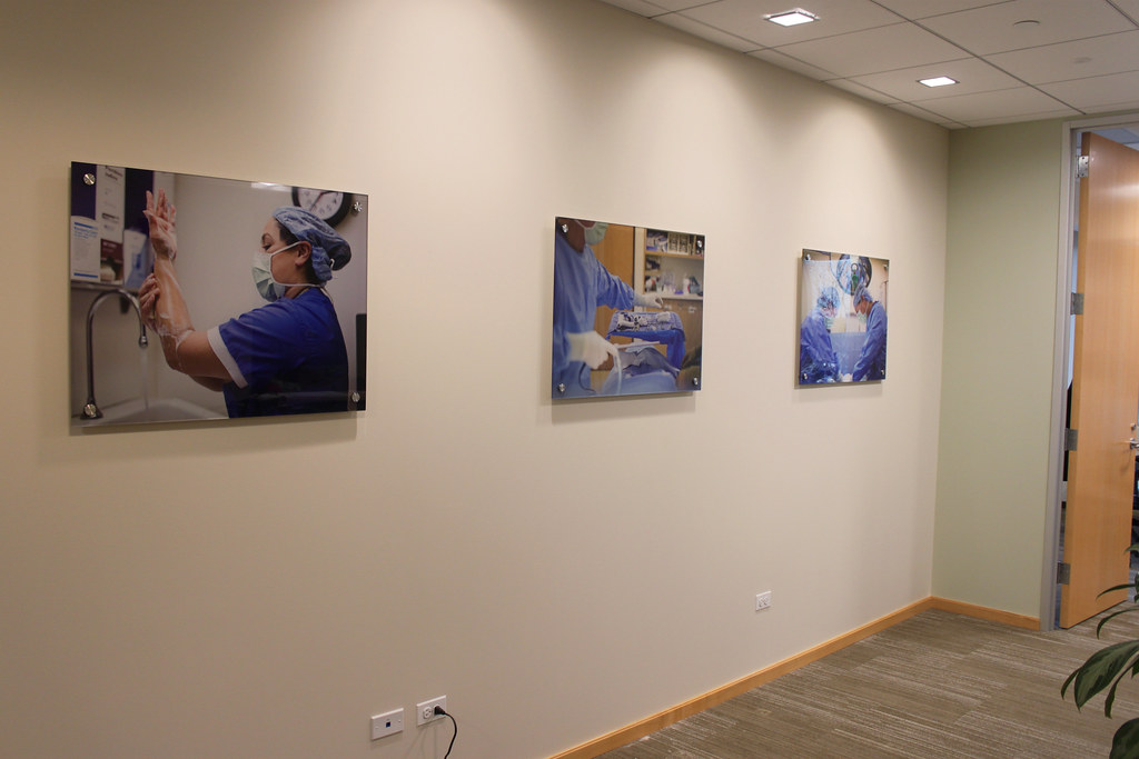 Photo print on clear acrylic panel installed with stainless steel standoffs for hospital surgical consultation room