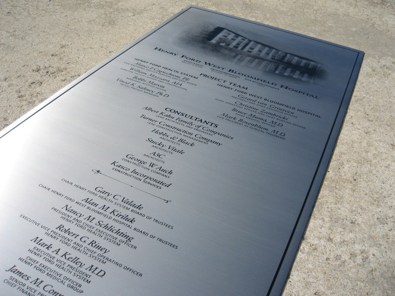 Etched stainless steel plaque. Recessed copy etched and paint filled.