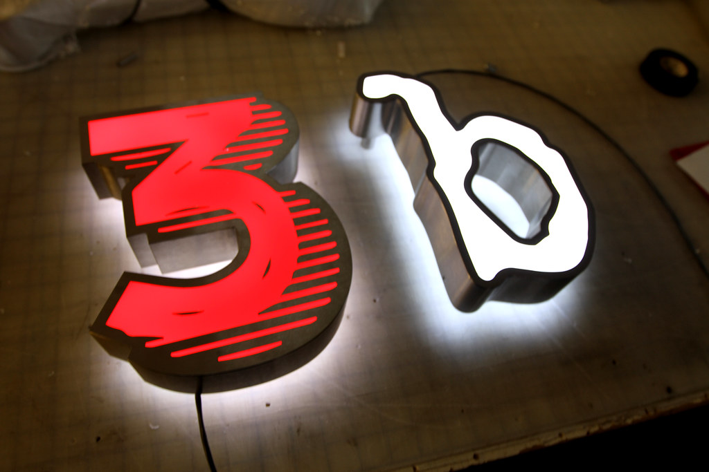 Backlit fabricated lettering assembled on backer panel for exterior business display signage