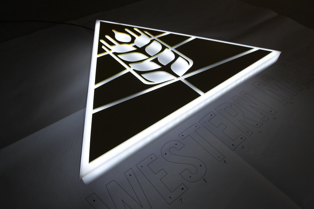 Backlit lettering and logo assembled on custom shape fabricated panel