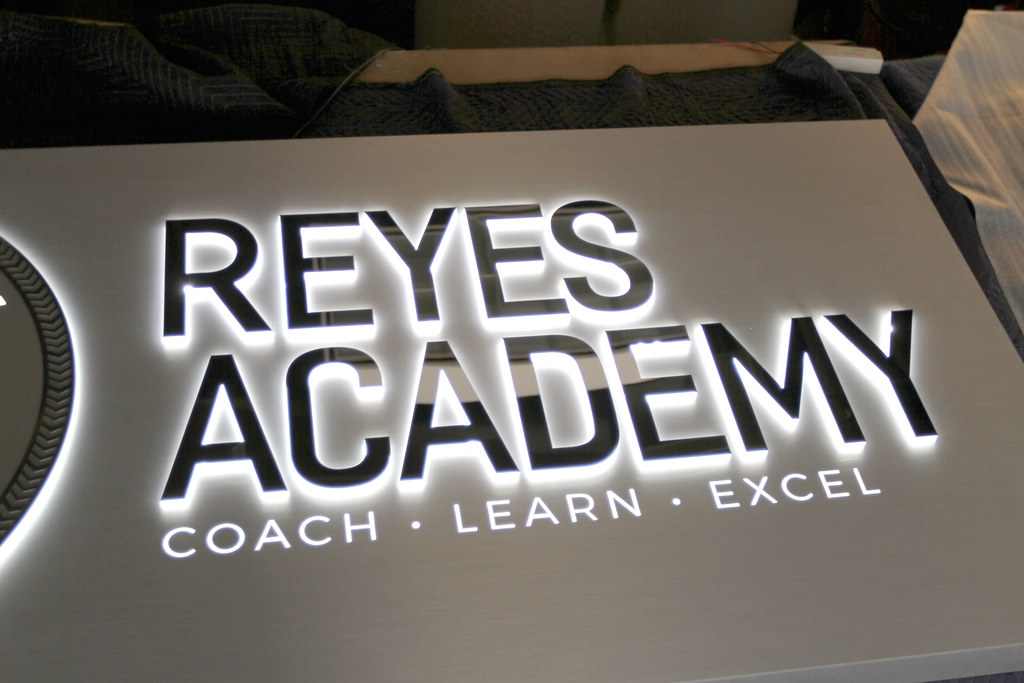 Fabricated panel sign with cut out accent lighted letters and halo backlight accent