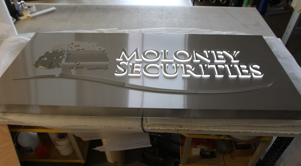 Lighted Lobby Sign Fabricated stainless steel panel with pushthru acrylic letters and graphics for edge lighting detail