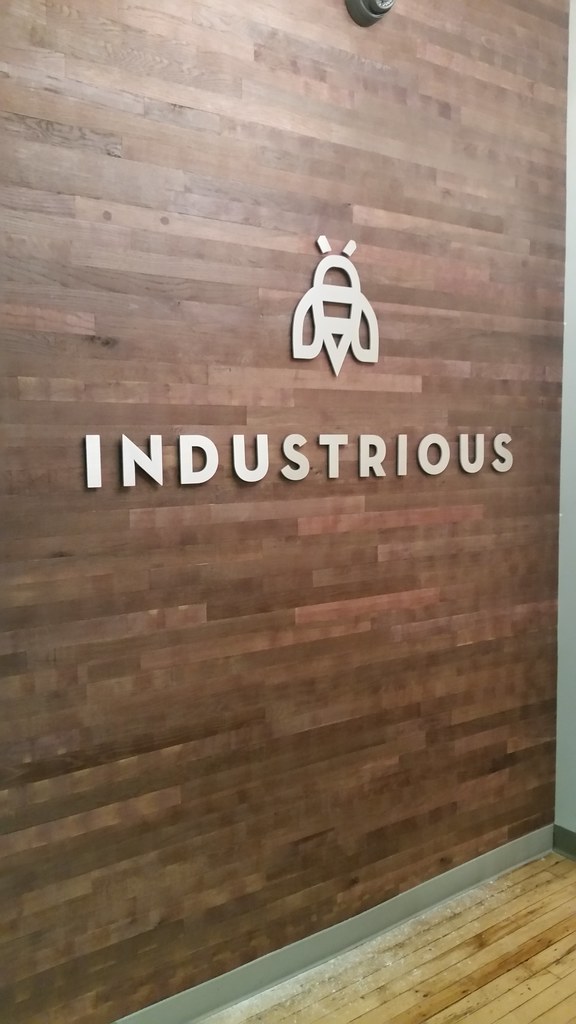 Cut brushed aluminum custom logo lettering for interior office lobby (tagline in yellow vinyl on drywall)